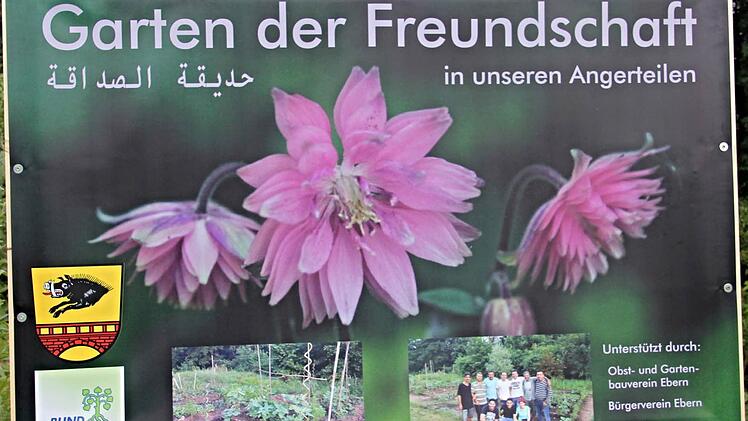 Ein großes Schild mit einer Akelei und den Namen der Unterstützer weist auf das Projekt "Garten der Freundschaft" hin, auch ein arabischer Schriftzug fehlt nicht.