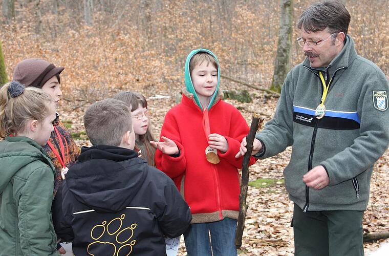 Ihren Praxistag erlebten die Kinder bei Harald Spiegel, der Förster und staatlich zertifizierter Waldpädagoge ist. Die Kinder gingen zunächst in Kleingruppen auf die Suche nach Spuren von Tieren und Menschen. Tierspuren waren leicht zu finden: hier eine abgebissene Baumknospe, dort ein Loch in der Rinde - und dann sogar ein Schädel, der schnell als Wildschweinschädel identifiziert war. Stolz stellten die Gruppensprecher ihre Ergebnisse vor.