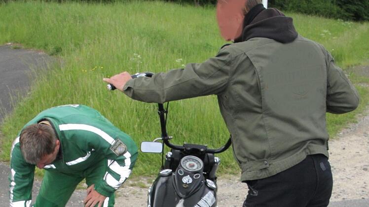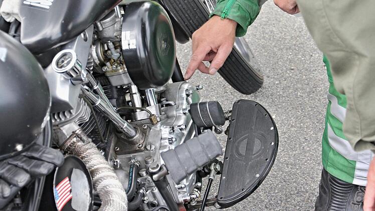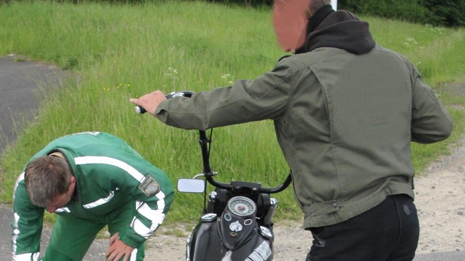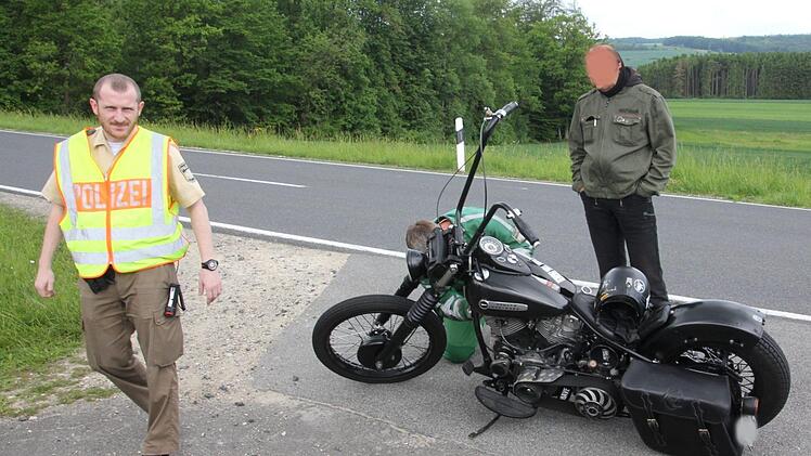 Die Ausfahrt am "Vatertag" mit seiner "altertümlichen" Harley Davidson hatte sich ein etwa 50jähriger Mann sicher anders vorgestellt. An der Kontrollstelle musste er sich einem längeren Stopp unterziehen. Die Polizeioberkommissare Werner Seifert und Michael Gerhart von der VPI Biebelrieth, begutachteten die mattschwarz lackierte Maschine. Beim Umrunden der Harley legte sich die Stirn von Seifert in Falten, da ihm an dem Prachtstück offensichtlich einiges nicht ganz geheuer vorkam. Hinzu gekommen ist, dass der Biker weder Führerschein noch einen Ausweis bei sich hatte. Seifert stellte Fragen zum Baujahr oder zu Veränderungen die vorgenommen wurden, welche der Besitzer nur unzureichend beantwortete und vorgab, dass die Veränderungen im Fahrzeugbrief eingetragen wären. Der war aber nicht greifbar. Seifert: "Die Maschine bleibt so lange stehen, bis alles vollends geklärt ist, notfalls lasse ich sie von einem amtlichen Sachverständigten begutachten." Er und der Besitzer der Harley wurden sich einig, dass der KFZ-Brief an die Kontrollstelle geholt wird. Das "schwarze Prachtstück" blieb zunächst "verwaist" am Hambach stehen. Zwischenzeitlich holte sich Seifert per Handy zu dem Gefährt noch weiteren fachlichen Rat ein.