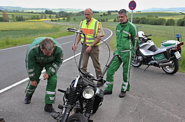 Die Polizeiinspektion Ebern kennt dieses Problem, ist verstärkt in den Hambachkurven präsent und versucht gezielt mit Schwerpunktkontrollen das Phänomen einzudämmen. Auch an Christi Himmelfahrt war die Polizei von zwölf bis 17.30 Uhr am Hambach, um den einen oder anderen Motorradfahrer einer Kontrolle zu unterziehen. Polizeioberkommissar Tobias Kern von der Polizeiinspektion Ebern war mit seinem Kollegen Polizeiobermeister Martin Göller und zwei Motorradspezialisten der Verkehrspolizeiinspektion (VPI) Biebelrieth an der Kontrollstelle.