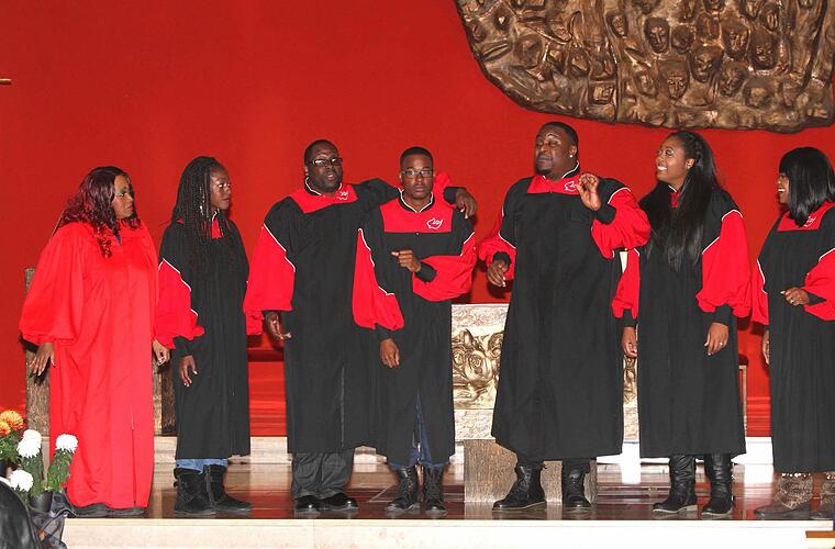 aus der Bibel stammten und bei denen es um Befreiung oder die Erlösung des Menschen von Übel und Leid ging. Und kaum einer konnte stillhalten, wenn die ersten Takte von Ohrwürmern wie "Down by the riverside" oder "Oh when the saints" angestimmt wurden. Mit ihrem Klatschen sorgten sie für den entsprechenden Rhythmus. Und es gelang den "Glory Gospel Singers" sogar, 30 Frauen und Männer zum Mitsingen in den Altarraum zu bewegen, wo sie die Melodien der Vorsänger nachsangen. Das Lob blieb nicht aus: "That was super".