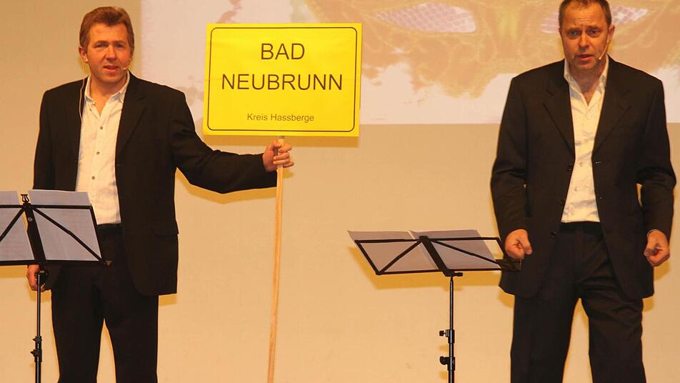 Es war schon eine tolle Geschichte, zu hören,wie der kleine Ort in den Haßbergen nun zu "Bad Neubrunn" wurde und in sehr pointierter Weise brachten die zwei Originale des Neubrunner Faschings, Wolfgang Schor und Hans-Jürgen Derra, den Bau des "Kneipp-Beckens" immer wieder auf den Punkt. "Der Fortschritt ließ nicht lange auf sich warten, ganz schnell warn da die Bodenplatten. Der Bürgermeister schaute sich auch mal um und fragte auch noch ganz dumm. Als Spender war er ihr größter Favorit, doch beim Karl-Heinz biss man auf Granit." Auch die Quelle machte plötzlich Probleme "abgesoffen noch bei Baubeginn, nun tropft sie nur so vor sich hin.