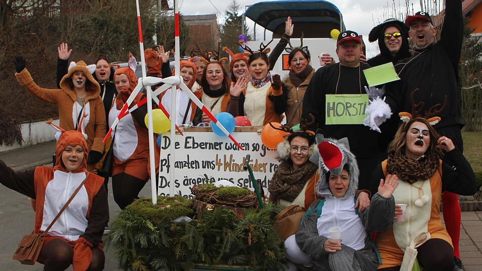 Die Neubrunner Schüler sind anscheinend nicht gewohnt, mit dem Bus zur Schule zu fahren. "Jeden Tag ein Spurt, sonst ist der Schulbus furt. Die Kinder müssen sprinten, sonst sehen sie den Schulbus von hinten." Als Zwerge waren die Buben und Mädchen des Kindergartens Kirchlauter dabei und die "Trinker-Bells" aus Kirchlauter hatten ihre Freude über das misslungene Windradprojekt. "Die Eberner waren so gemein und pflanzten uns vier Windräder ein. Das ärgerte uns sehr, drum setzten wir uns zur Wehr."