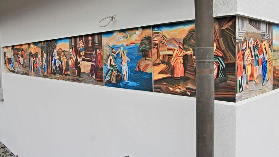 Die Bilderserie am Gemeindehaus Memmelsdorf beziehe sich direkt auf dem historischen Bilderzyklus im Innenraum der gegenüberliegenden Kirche, sagt Mayer.