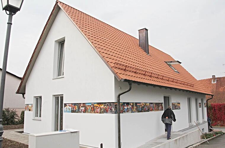 Mit dem Künstler Gerhard Mayer habe man jemandem gefunden, der sich viele Gedanken über das Projekt gemacht hätte. Er sei erst einmal einige Zeit durch Memmelsdorf gelaufen, um den Ort auf sich wirken zu lassen, bevor er erste Vorschläge unterbreitete. "Was wir heute an der Fassade des Hauses sehen, ist meiner Meinung nach ein gelungenes Stück Kunst, was andere auch so sehen." Zwei Spenden in Höhe von je 1000 Euro und eine über 500 Euro wurden für die Bilder gegeben, freut sich die Geistliche. Sie weiß, dass es für die Gemeindeglieder interessant ist, was die Kunstwerke, die rund um an der Fassade des Gebäudes zu sehen sind, kosten. "1000 Euro pro Bild, insgesamt 35 000 Euro sind das." Sie kommt nochmals auf die Bilder zu sprechen und sagt: "Das Schöne ist, wenn man aus der Kirche herauskommt, sieht man die Bilder als Bilder und wenn man näher kommt, zerfallen sie."
