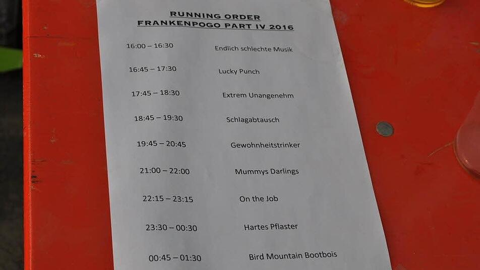 Den Anfang am Nachmittag machten "Endlich schlechte Musik" aus Erlangen/Nürnberg, "Lucky Punch" aus Berlin, denen die Hessen "Extrem unangenehm" folgten. Schon am frühen Abend sorgte das heimische Quartett "Schlagabtausch" für Stimmung im Zelt.