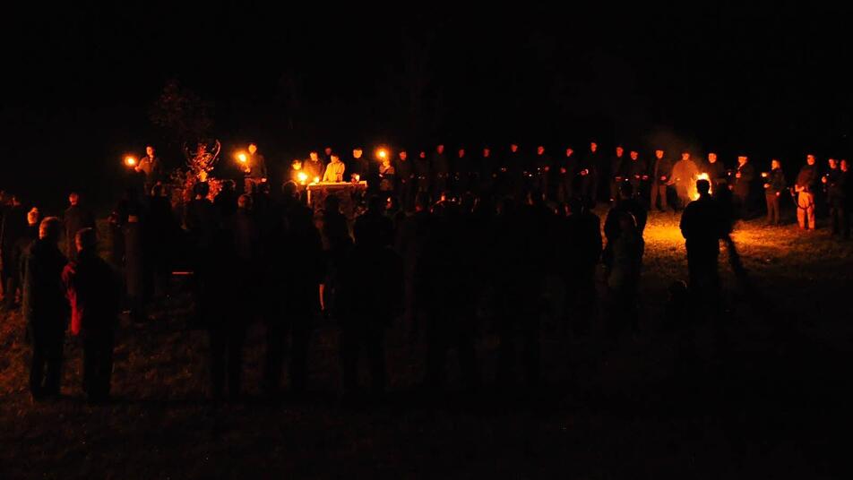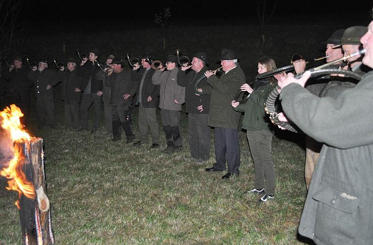Es war schon eine besondere Stimmung auf der Wiese, im Schein der vielen Schwedenfeuer, und mit den 19 Bläsern der Jagdhornbläsergruppe Haßberge, die unter Leitung von Hornmeister Hermann Gagel spielten. Neben dem Altar stand ein großes Hirschgeweih, das von zwei Fackelträgern angeleuchtet wurde.