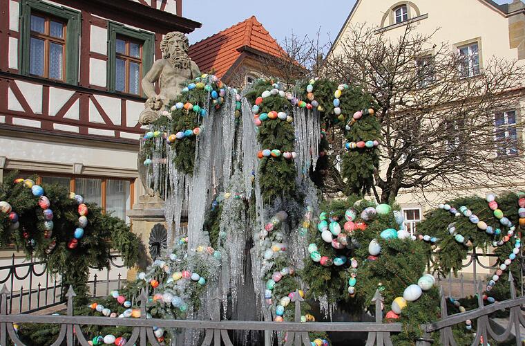 Eine bizarre Form hat der österlich geschmückte Neptunsbrunnen auf dem Marktplatz nach dem Anbringen der mit Eier behängten Girlanden über Nacht angenommen.