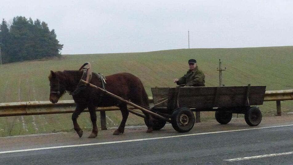 Da das Straßennetz nicht gut ausgebaut ist, radelte Wagner auf seiner Tour über Hunderte von Kilometern auf der Autobahn. Das stört in Weißrussland und im Baltikum niemand, immer wieder begegnet man dort auch einheimischen Radfahrern, Traktoristen mit Anhängern oder gar Pferdefuhrwerken.