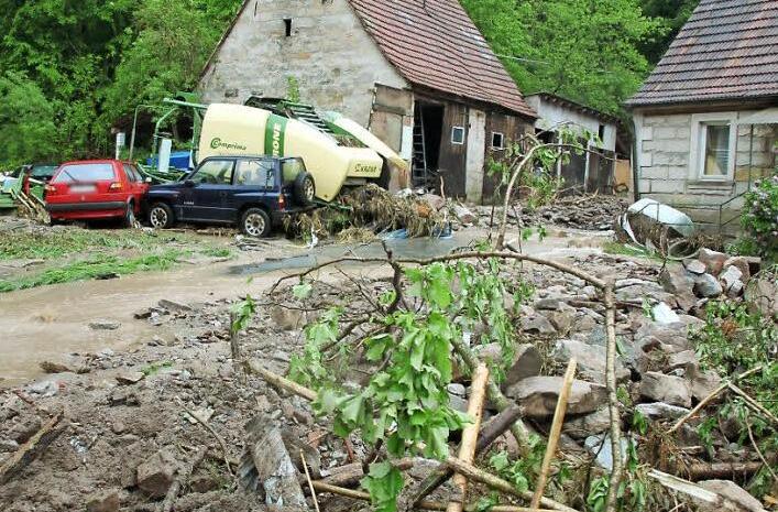 Außerordentliches Hochwasser Die Folgen des Wolkenbruchs am Abend des Pfingstsonntag lassen sich kaum in Worte fassen, in Zahlen auch nicht. Deshalb müssen bürokratische Umschreibungen herhalten: "Es war ein fünf Mal 100-jähriges Hochwasser an einem Abend", hat die Bürgermeisterin von Vertretern des Wasserwirtschaftsamt erfahren. So wenig griffig diese Formulierung, so weitreichend deren Auswirkung: "Wir haben eine Förderzusage von 80 bis 85 Prozent erhalten, müssen uns aber an die Planungs- und Vergabevorschriften der Regierung halten." So entstehen Schutzwälle entlang der Erdwege und auch Regenrückhaltebecken. Bis Ende März sollen die Arbeiten abgeschlossen sein.