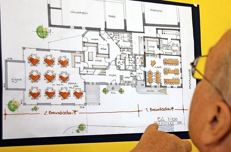 Die Schlagbohrer hämmern schon seit einigen Tagen, in drei Monaten soll der Einzug erfolgen: Die Pläne für das neue Pfarrzentrum der Pfarrgemeinde St. Laurentius erläuterte Architekt Rudi Hemmer aus Deusdorf am Sonntag im Rahmen des Pfarrfest inmitten der Baustelle.