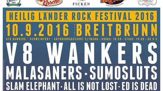 Centerstage V8 Wankers (Rock`n Roll, Punk`n Roll, Speedrock aus Offenbach), Malasaners (Folk-Punk aus Madrid), Sumosluts (Rock, Stoner aus Bamberg), Slam Elephant (Rock aus Bamberg), All Is Not Lost (Rock aus Ebern), Ed Is Dead (Hardcore aus Schweinfurt) und Liquid Dinosaur (Poolpuncherrock aus Obertheres)