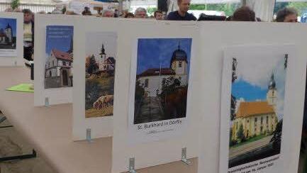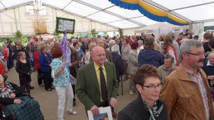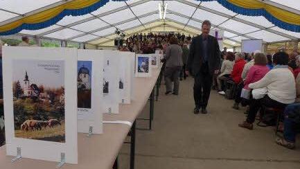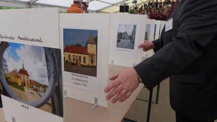 Mit den Worten "HERR, auf Dich hoffe ich..., Meine Zeit steht in Deinen Händen", hatte zuvor Dekan Jürgen Blechschmidt auf die Bedeutung der Zeit wie auch auf gute und weniger gute Geschehnisse in allen Zeiten seit Bestehen des Ortes Rügheim verwiesen. Alle Gemeinden waren in Vorbereitung des Kirchentages aufgefordert worden, ein Foto mit ihrer Kirche und dem Vermerk über das Datum ihrer Weihe mitzubringen. Auf einer langen Reihe mitten im großen Festzelt, stellten die Christen in vier Zeitetappen, je nach Dauer des Bestehens ihres Gotteshauses, die Bilder auf einem fiktiven Zeitstrahl ab. Dieser solle verdeutlichen, "wie viel Zeit Christus uns schenkt", erläuterte Blechschmidt.