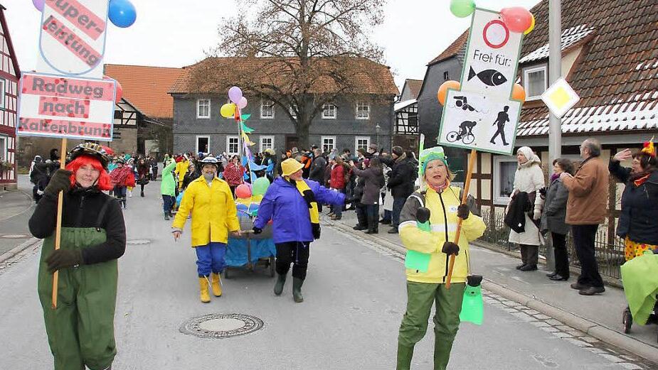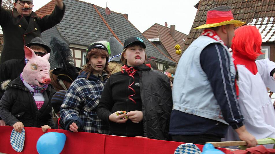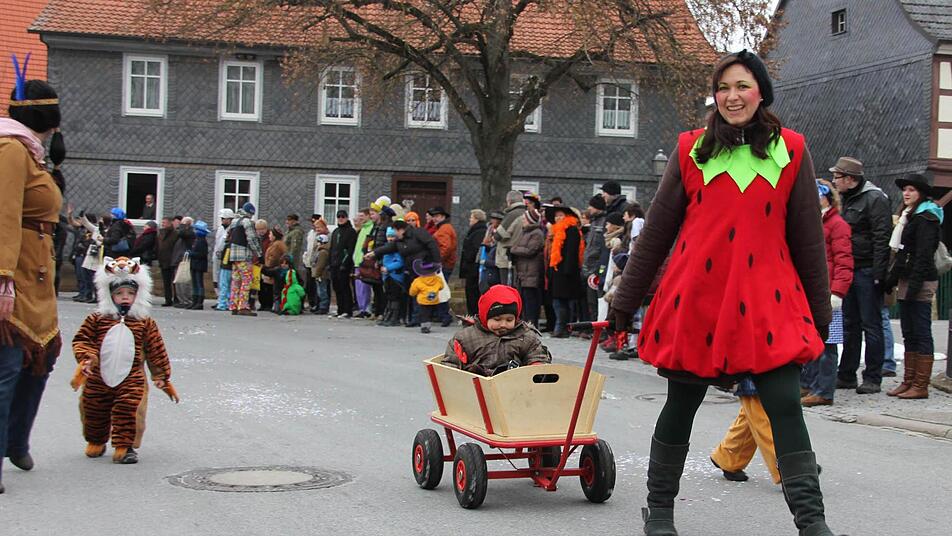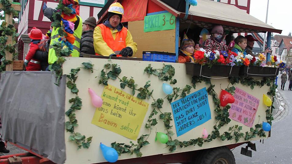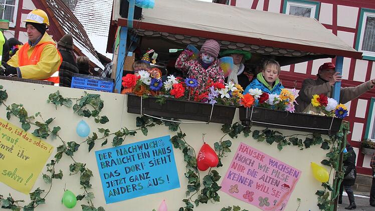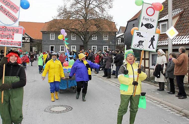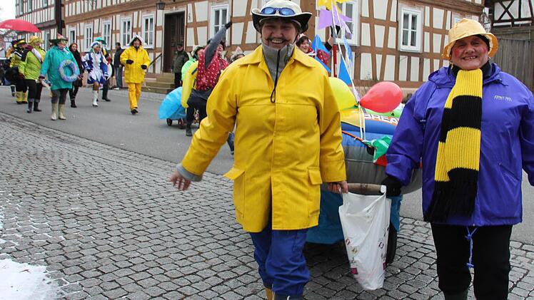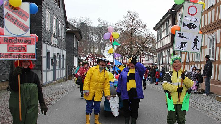 Die nehmen's gelassen, wie es sich am gestrigen Dienstag zeigte, als sich der Umzug in Bewegung setzte. Nicht ganz so lustig fanden es dabei die VfL-Damen, was beim Straßen-Neubau in Richtung Kaltenbrunn passierte. Weil der Rad- und Gehweg nicht hochwasserfrei angelegt wurden, zogen sie ein Schlauchboot durchs Dorf, um ohne nasse Füße nach Oberfranken zu gelangen.