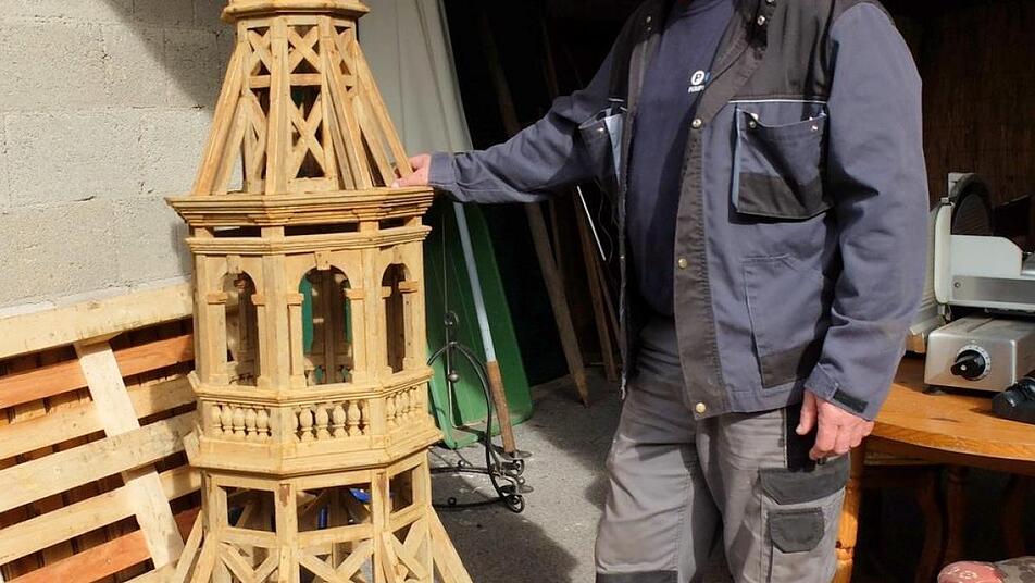 Auch auf das zweite Fundstück wurde ich im April durch einen Anruf aufmerksam gemacht. Hubert Müller aus Untermerzbach sagte, dass er unter einem alten Holzstapel in seiner Scheune unerwartet auf ein Turmmodell gestoßen sei, das möglicherweise eine Kirchturmspitze aus der Gegend darstelle. Am nächsten Tag habe ich mir die Konstruktion angesehen: Es war eindeutig ein Turmmodell, 180 Zentimeter groß und sorgfältig gearbeitet. Ein Unikat.