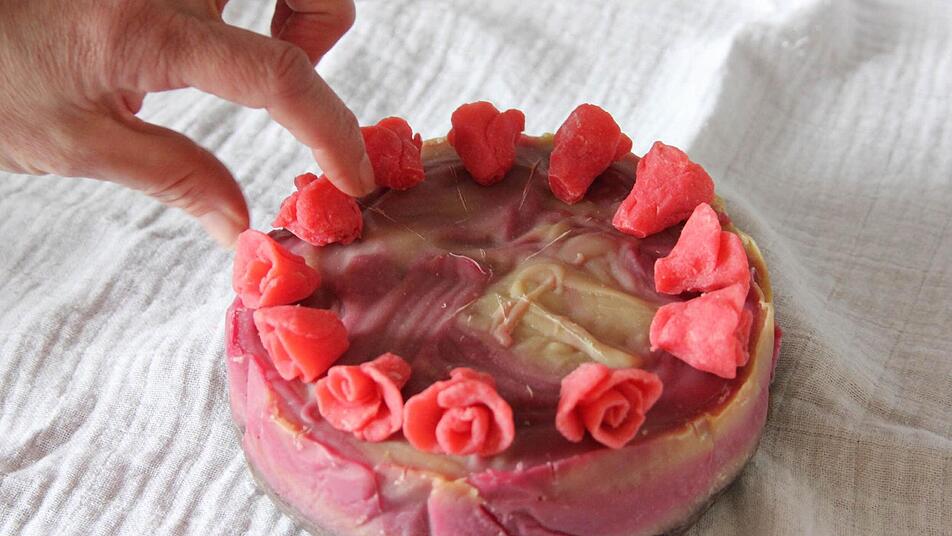Gerade baut die 47-Jährige in ihrer "Villa Schaumberg" in Knetzgau eine Seifentorte für die "Kulinea". Die rosafarbene Kreation riecht zum Anbeißen lecker. Öle und Pflanzenbutter stammen aus kontrolliert ökologischem Anbau. Im Keller des Einfamilienhauses stapeln sich die Rohstoffe, aus denen im Kaltrührverfahren die duftenden Naturerzeugnisse werden. Rezepte, Namen und Verpackungen denkt sich die ehemalige Telekom-Beamtin selbst aus.