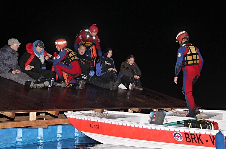 Einige waren sogar vom Dach gerutscht und in den See gefallen. Sie wurden von Tauchern und Schwimmern der Rettungskräfte aus dem kalten Wasser geholt und auf die Rettungsboote gebracht.