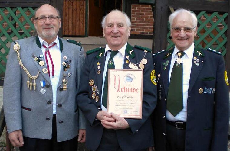 Dominka ist seit 1982 bis heute Schriftführer und führte die Kartei der Mitglieder. Von 1984 bis 1988 war er als Pistolenschütze im Einsatz, ehe er von 1999 bis 2006 etwas kürzer trat. Seit 2007 ist er in der Auflagerunde wieder voll dabei. Dominka hat sage und schreibe 149 Schützenscheiben gemalt und zudem viele Holzarbeiten gefertigt.