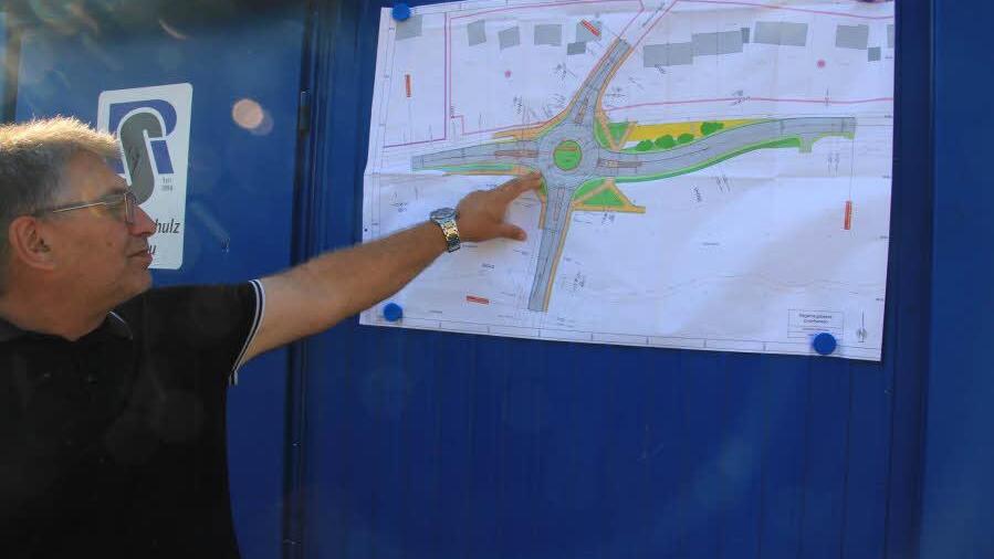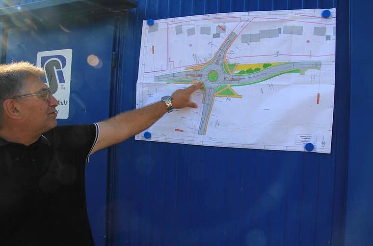 Frank Stark, der als Bauleiter der Firma Scholz mit durchschnittlich sechs Mitarbeitern am bau beschäftigt ist, sagte, dass der Kreisverkehr insgesamt einen Durchmesser von gut 30 Metern haben werde. Der Innenkreis wird 15 Meter betragen, die Fahrspuren acht Meter. "Das ist ausreichend an dieser Stelle", so das Urteil des Bauleiters.