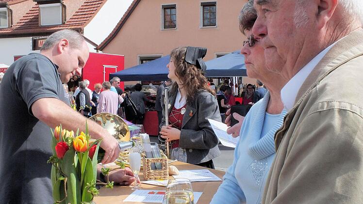 Sander Wein- und Korbmarktes. Sand liege zwar nicht im Zentrum des fränkischen Weinanbaues, sagte er. Aber die junge Sander Winzergeneration habe durch engagierte und erfolgreiche Winzerarbeit sowie durch ihre oftmals prämierten Weine und aufsehenerregende Erfolge in den letzten Jahren den Ort immer mehr in den Mittelpunkt des Interesses gerückt. "Beschreiten Sie diesen Erfolgsweg weiter, denn dadurch repräsentieren Sie Ihre innovative Gemeinde und leisten darüber hinaus einen Beitrag zum Ansehen des Frankenweines", appellierte Noppenberger.