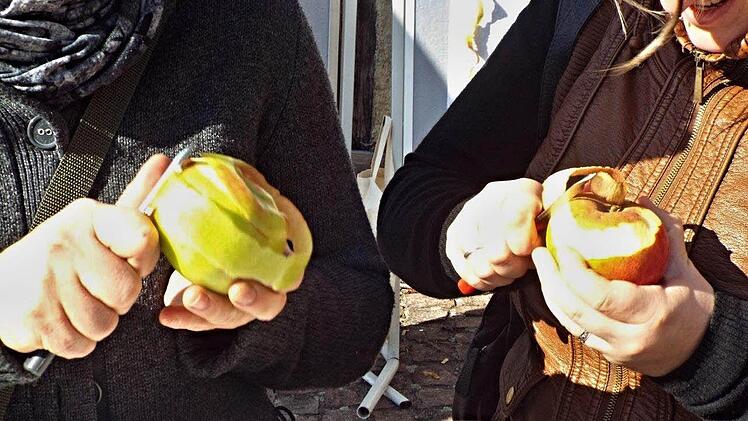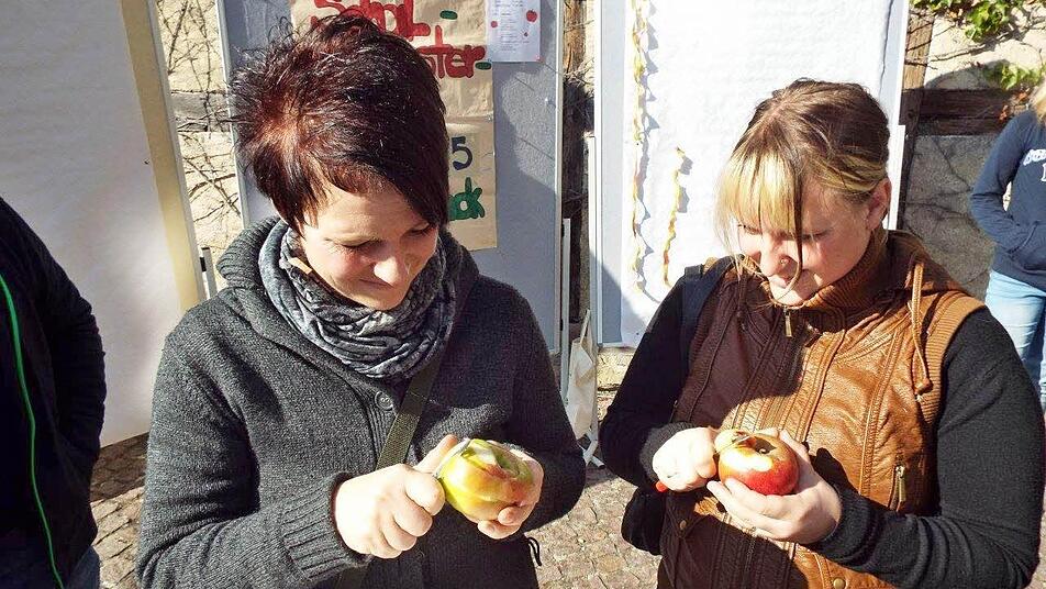 Darüber, dass alles mit "rechten Dingen" zuging, wachte Barbara Ullmann vom Bund Naturschutz. So etwa 30 bis 40 Personen haben ihr Glück beim Schälwettbewerb versucht, wobei diese stets von neugierigen Blicken der Kontrahenten und sonstiger Besucher begleitet wurden. Neben den genannten Siegern waren bei den Erwachsenen noch Alexander Adam (159 cm) und Ana Gaspic (153 cm) und bei den Kindern Carolin Jakob (63 cm) und Markus Jakob (60 cm) erfolgreich. Die Preisverleihung nahm der 2. Vorsitzende des BN Ebern, Alexander Hippeli vor. Auch mitgebrachte Äpfel konnten von einem Fachmann bestimmt werden. Ausgestellte und bezeichnete Apfelsorten leuchteten aus den Körben und machten Appetit auf Obst. Beim Markttag hatten auch die Geschäfte in Ebern geöffnet.