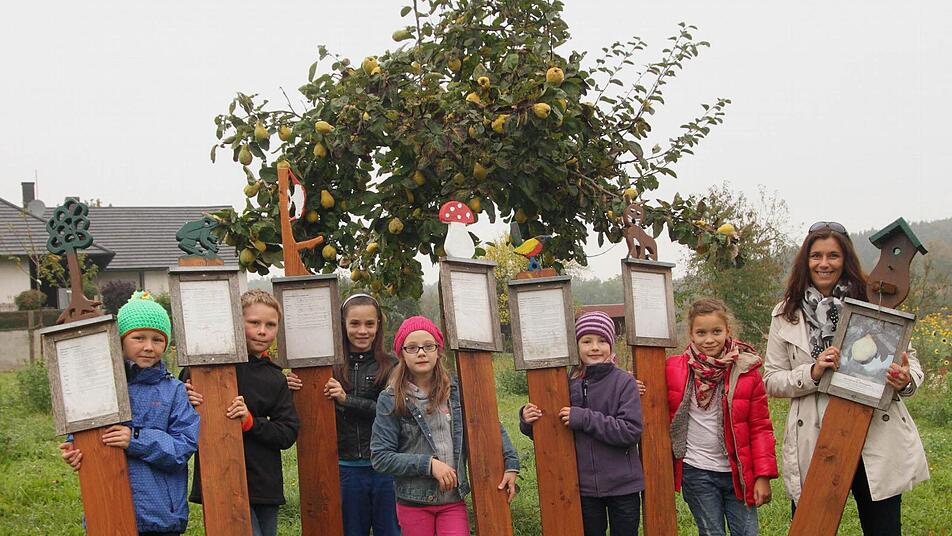 In Kirchlauter nimmt sich eine Grundschulklasse der verschiedenen Fruchtsorten an. Die Kinder haben Tafeln gefertigt, um die 52 verschiedenen Obstsorten vorzustellen.