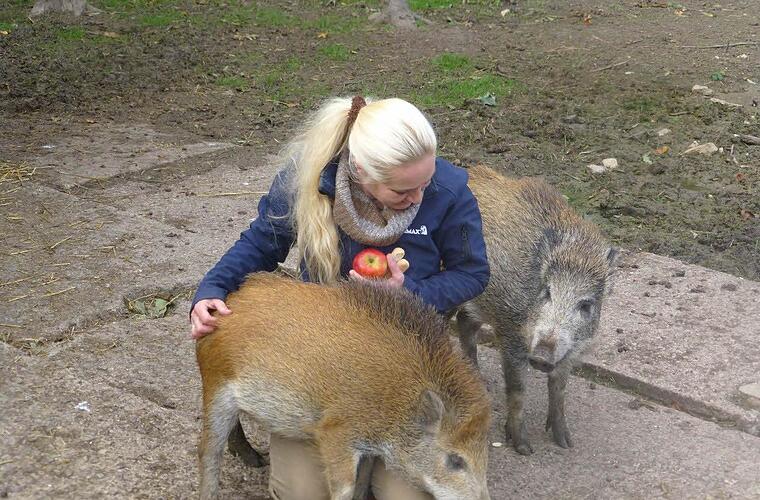 Seine Recherche führte zum Freizeitpark in Possen, Thüringen. Dort war inzwischen Lisbeth herangewachsen, ebenfalls ein ausgestoßenes Wildschweinkind, für das extra ein eigenes Gehege gebaut worden ist. Weil da noch gut Platz war, durften Bine und Luise mit einziehen. Dass es Luise und Bine in ihrem neuen Zuhause auch gefällt, davor überzeugte sich Britta Merkel und besuchte ihre beiden Schützlinge.