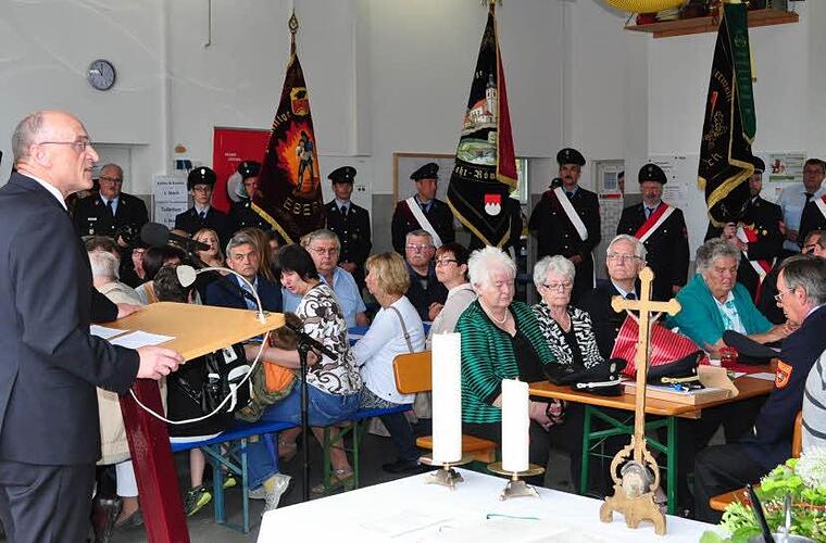 und der evangelische Gemeindereferent Helmut Leykauf, den Feuerwehrleuten bestens bekannt als Ehrenkreisbrandrat im Ruhestand. Dieser hielt auch die Predigt, in der er den ehrenamtlichen Dienst der Feuerwehrleute herausstellte. "Niemand liebt mehr als der, der bereit ist, das Leben für seine Freunde einzusetzen; dem Anderen zu helfen, seine Lasten zu tragen. Wenn ihr das tut, erfüllt ihr das Wort Gottes - den Auftrag Gottes zur Nächstenliebe", rief Leykauf den Feuerwehrleuten zu. Er beglückwünschte die Pfarrweisacher Wehr zu dem Fahrzeug, das eine hohe Anerkennung und Würdigung ihrer Arbeit sei. Pater Michael Stutzig segnete das Fahrzeug mit Weihwasser und die anwesenden Gäste.