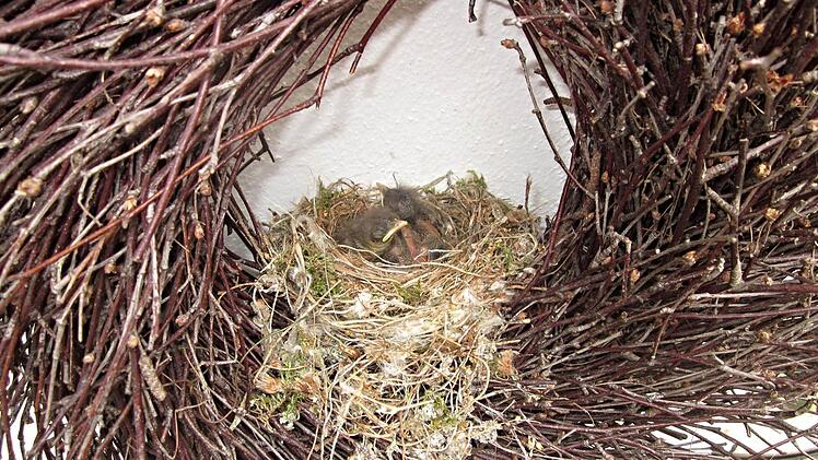 Freudig überrascht war Manuela Baum aus Untermerzbach als sie vom Urlaub zurückkam und feststellte, dass ein Vogelpaar die Einladung in einem "Willkommenskranz" neben ihrer Haustüre angenommen und dort sein Nest gebaut hatte. Ein Grauschnäpperpärchen hatte sich diese Stelle für das Gelege ausgesucht.