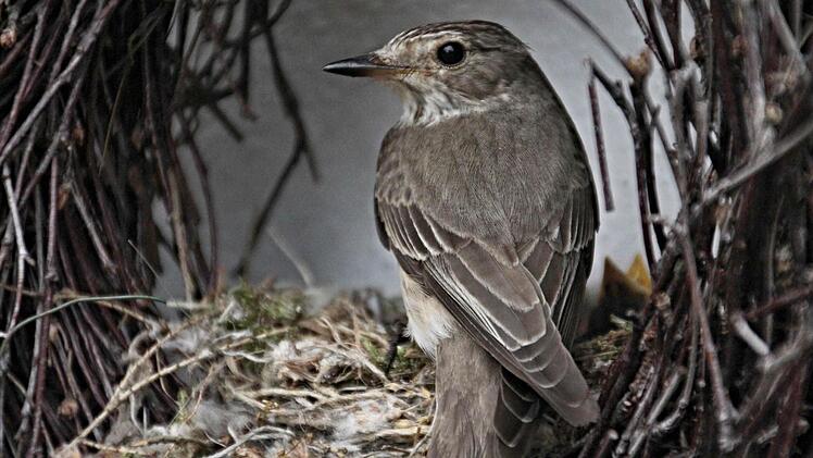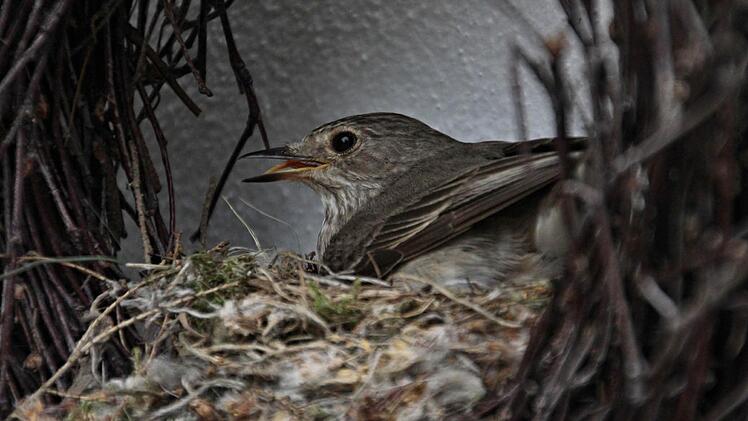 Dort recken gegenwärtig zwei Jungtiere ständig die Hälse nach Futter. Wie Manuela Baum sagt, wären zunächst vier Eier im Gelege gewesen. Jedenfalls freut sie sich mit ihrer Familie, dass sich der Grauschnäpper mit seinen flauschigen Jungtieren wohlfühlt, obwohl ihnen quasi jeder ins Nest gucken kann.