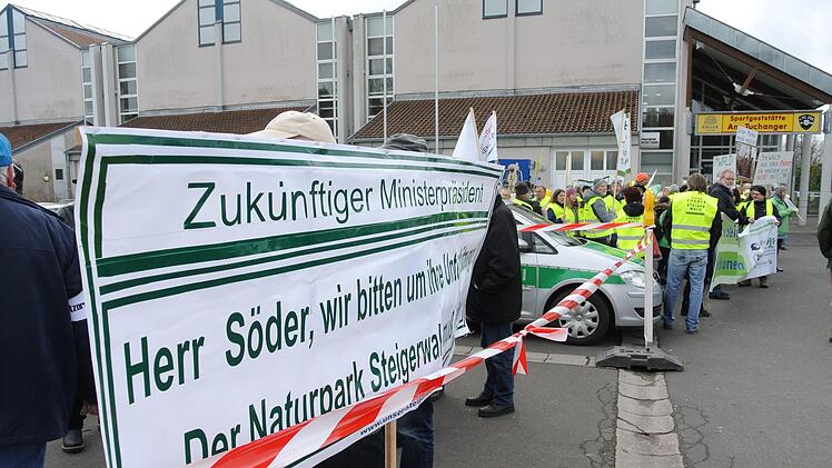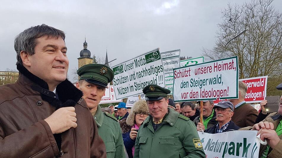 Nationalpark-Gegner und -Befürworter nutzten den Besuch des designierten Ministerpräsidenten Markus Söder in Zeil für Demos.
