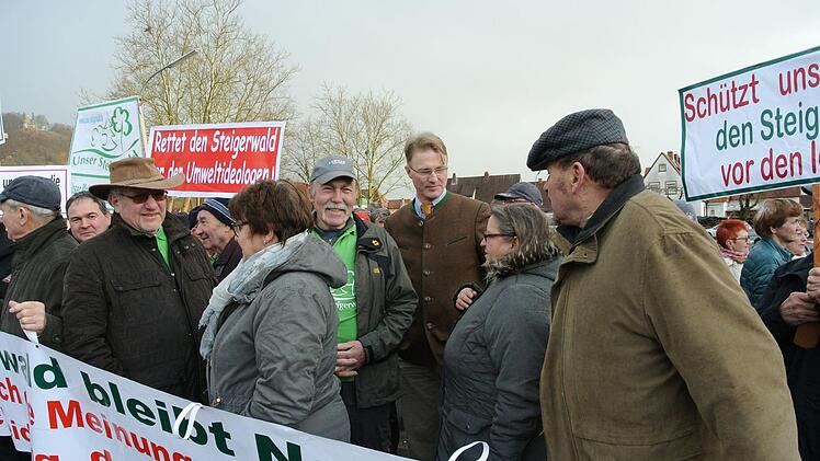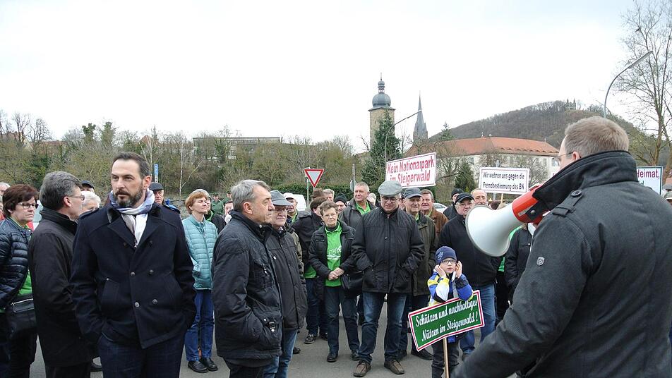 "Wir wollen, dass endlich a mal endgültig a Ruh ist", bekräftigte aus dem Lager der Nationalpark-Gegner einer der Privatwaldbesitzer aus Oberaurach. Die getroffene Entscheidung gegen einen Nationalpark müsse jetzt auch bleiben. Rauhenebrachs Bürgermeister Matthias Bäuerlein betonte als Versammlungsleiter der Nationalpark-Gegner, dass die 20 Gemeinden aus dem Steigerwald mit ihrem "Besseren Konzept" klar Stellung bezogen hätten. Man sei "nicht nur gegen etwas, sondern auch für viele Dinge, der Naturschutz spielt eine Rolle, was aber den Nutzen nicht ausschließt".