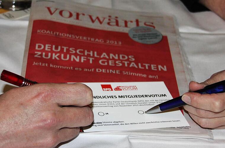 Vor ihnen liegt eine Stimmkarte, die nur zwei Optionen aufweist: Ja oder Nein. Dazu eine Sonderausgabe der SPD-Postille "Vorwärts", die sämtliche Details der in Berlin ausgehandelten Vereinbarung enthält. "Schwammige Formulierungen", wie Stefan Batz, der jüngste in der Runde, findet. "Trockene Materie, das ganze Pamphlet habe ich nicht durchgelesen", bekennt Ortsvorsitzende Ulrike Trunk. Rainer Haseloff: "Wer das alles durchliest, verfügt über einen eisernen Willen."