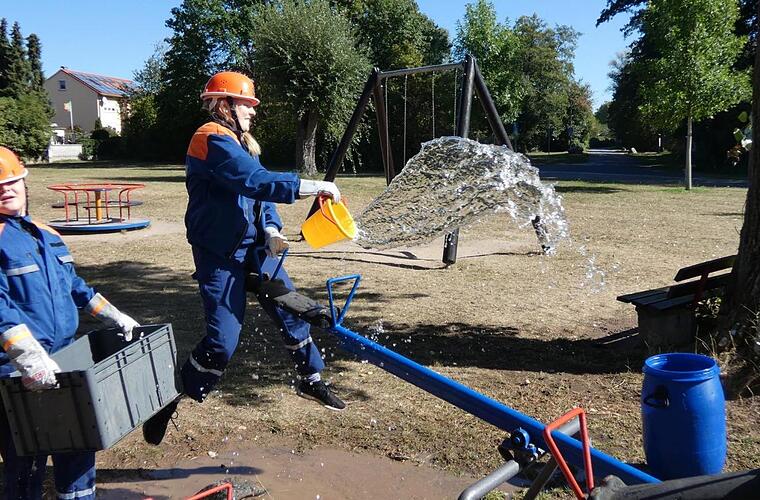Auf dem Wörther Spielplatz galt es zum Beispiel auf einer Wippe sitzend so viel wie möglich Wasser in eine Tonne zu werfen. Zuvor musste das Wasser aus dem Altmain geschöpft werden und den Mitspielern hoch oben auf dem Spielgerät zur Verfügung gestellt werden.