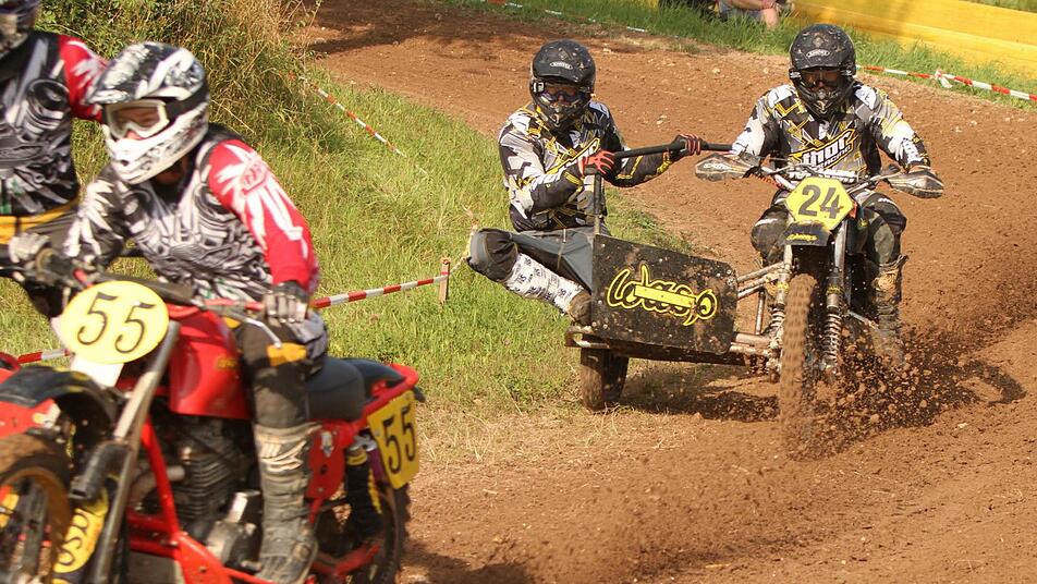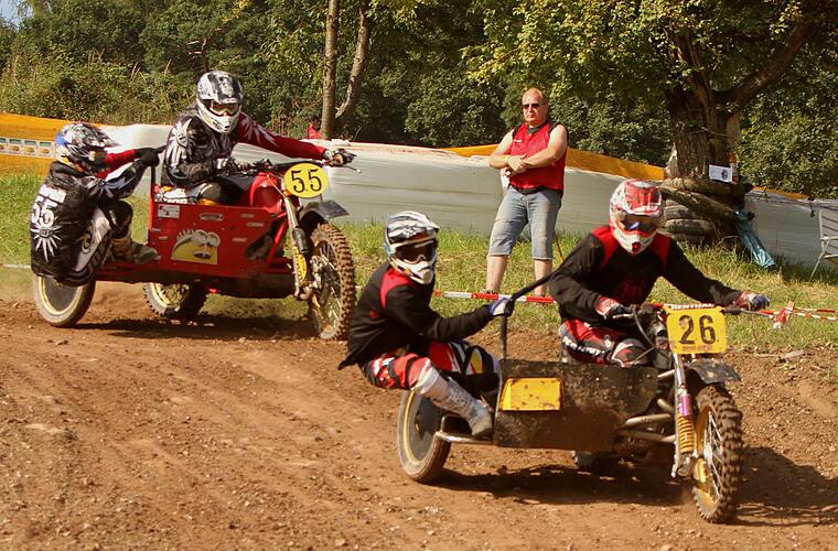 Weitere Höhepunkte für die Zuschauer waren die Rennen der Seitenwagen-Gespanne, die um Punkte für den "Veteranen-Cup" fuhren. Hier sah man deutlich das Können der "alten Hasen" auf der Piste, die sowohl in akrobatischer Weise ihre Gewichtsverlagerungen in den Kurven zeigten, aber auch vor Sprüngen über die Hügel nicht zurückschreckten.