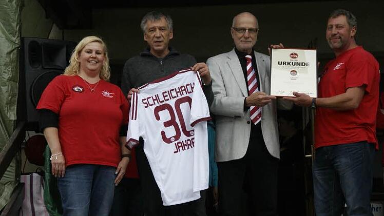 Günther Koch, bekannt als Radiomoderator und Stadionsprecher des FC Nürnberg, ist einer von acht Aufsichtsräten des "Club". Mit dem Fan-Beauftragten Jürgen Bergmann kam er nach Oberschleichach, um dem Fanclub zu gratulieren. 15 Mitglieder dazugewonnen hat der Fanclub in den letzten fünf Jahren, darüber freuten sich Koch und Bergmann.