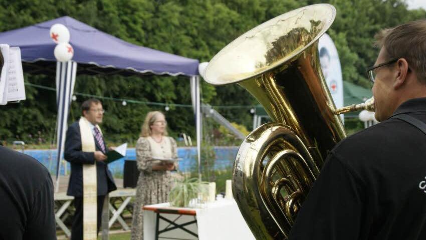 Die Suche nach Erfrischung Am späten Nachmittag begann der ökumenische Gottesdienst. Pastoralreferentin Barbara Heinrich und Pfarrer Michael Foltin begrüßten die "liebe Schwimmbad-Jubiläums-Gemeinde". Pfarrer Foltin zeigte in seiner Predigt viele Parallelen zwischen der Bewegung im Wasser, der Suche nach Erfrischung und Abstand von den täglichen Verpflichtungen und dem Glauben auf. Schließlich dürfe der gläubige Mensch darauf vertrauen, dass Gott ihn trägt wie das Wasser den Schwimmer.