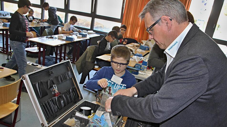 Vorne am Lehrertisch hat Uwe Rosenberger sein "Werkzeuglager." In einem großen Koffer hat er alles parat, was die Technikfreaks zum Basteln brauchen. Rosenberger ist quasi der Lagerist, bei dem die Kinder benötigte Teile holen können. Er sagt, dass das Bayernwerk das Projekt seit dem Jahr 2012 unterstütze. "Die Azubis geben den Schülern Anleitung bei ihrer Arbeit. Das ist auch für sie eine neue Erfahrung, da sie sich quasi als Ausbilder sehen können und an Sozialkompetenz gewinnen."