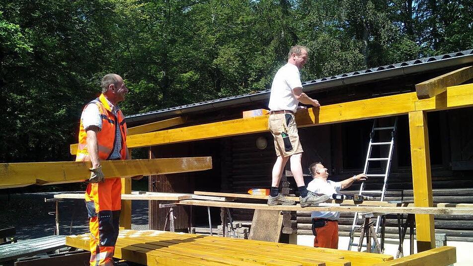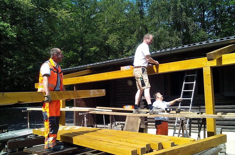 Schreinerarbeiten, wie hier der Anbau eines Vordaches am Zeltplatz Reutersbrunn, werden von Thomas Holzheid, Franz Dorsch und Rainer Müller vorgenommen. Foto: Christian Raehse, Bauhof Ebern