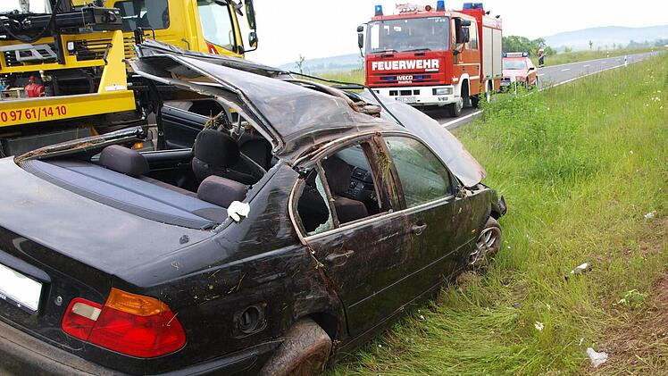 Nach ersten Erkenntnissen der Beamten befuhr der 23-jährige Fahrzeugführer aus Maroldsweisach gegen 6 Uhr die B 303 von Hafenpreppach kommend in Fahrtrichtung Schweinfurt. In einer leichten Linkskurve kam er nach rechts ins Bankett, übersteuerte und schleuderte quer über die Fahrbahn in den linken Straßengraben. Dort rammte sich sein Fahrzeug in die Böschung und überschlug sich mindestens einmal, bis es auf der Seite liegend im Graben zum Stehen kam. Im komplett beschädigten BMW wurde einer der Fahrzeuginsassen eingeklemmt, so dass das Dach des auf der Seite liegenden Fahrzeugs durch die Feuerwehr zur Bergung des 26-jährigen Verletzten, der aus Ebern stammt, abgenommen werden musste.