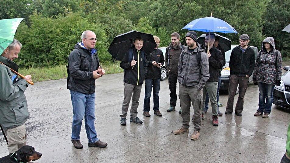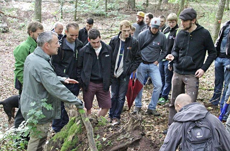Gnannt fragt, welche Bodenbeschaffenheit hier vorhanden ist. Einige der Teilnehmer zerreiben Boden zwischen ihren Fingern und kommen zum Schluss, dass es sich um Feuerletten handelt. "Ein etwas schwieriger Boden", erklärt Gnannt "der als Standort für die tiefwurzelnde Eiche recht gut geeignet ist." Dabei fallen die Blicke der Teilnehmer auf einen stattlichen Eichenstamm in der Nähe, an dem die Schreinermeisterschüler Alter und Qualität des Stamms bestimmen sollen.