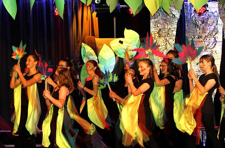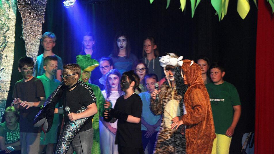 Mit vielen engagierten Schülern hatten die Lehrkräfte Elke Barnickel und Constanze Büller mit einer farbenprächtigen Kulisse für den großen Auftritt gesorgt und dabei viele bunte Papageien oder freche Affen für die Lianen gebastelt. Das Technikteam der Schule setzte dann noch alles ins rechte Licht und sorgte auch für den richtigen Ton und die musikalischen Untermalungen.