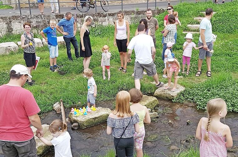 Nach der Grenzbegehung fand als Attraktion für die Kinder ein Wettrennen der besonderen Art statt: das erste Krümler Altach-Entenrennen. Am Nepomuk in der Vorstadt herrschte reger Andrang, als der Vorsitzende Paul Schuler das Startkommando für das Entenrennen gab. Auf der renaturierten Altach mit ihren Windungen und Sprungsteinen trieben die kleinen farbigen Quietscheenten ins Ziel. Begleitet von den Kindern, die ihre Enten anfeuerten, kamen alle am Antoniusheim an. Sieger war die blaue Ente mit der Nummer 16. Jedes Kind durfte seine Ente behalten und erhielt einen Preis. Nachdem das Entenrennen bei den Kindern so gut ankam, wird schon über eine Fortsetzung spekuliert.