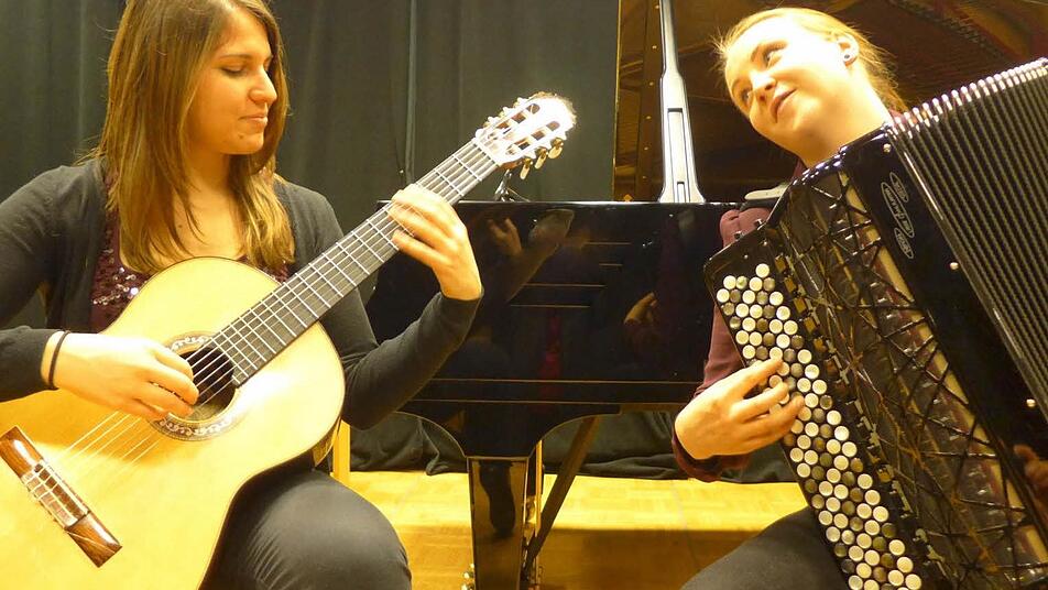 Zwei junge Damen traten mit Akkordeon und Gitarre auf, beide "Erasmus-Stipendiatinnen". Die Finnin Vilma Räikkönen (Akkordeon) und die Spanierin Ana Lama (Gitarre) hatten Tomas Gubitsch auf das Programm gesetzt, einen 1957 in Argentinien geborenen Komponisten und vielseitigen Musiker. Mit Feinheit und Intensität setzten sie ein Werk, das eigentlich für zwei Lauten geschrieben worden war, akzentreich um und zeigten in ihrem zweiten Vortrag, der "Ricercata Konsertata" eines hierzulande gänzlich unbekannten Komponisten namens Johann Madelart, ganz andere Interpretationsweisen. Einfühlsam, eine wunderbare Melodie teils klopfend, schlagend und gezupft dargeboten, harmonierten ihre unterschiedlichen Instrumente bestens miteinander.