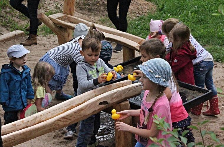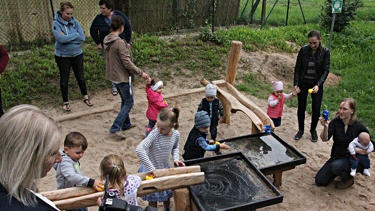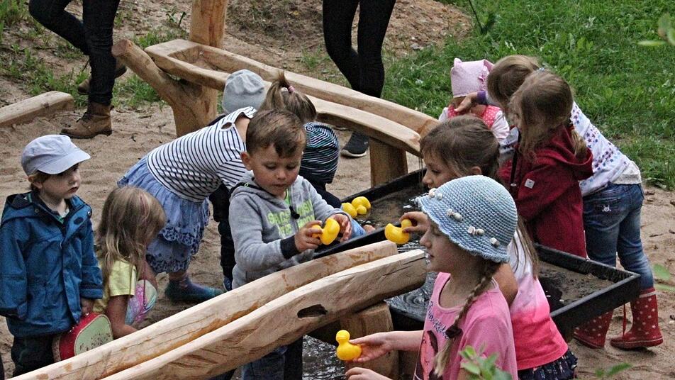 Dicht umringt, der neue Wasserspielplatz im Kindergarten "Sonnenschein" in Memmelsdorf. Auch Quitschentchen wurden in den Wasserrinnen auf die Reise geschickt. Foto: Helmut Will