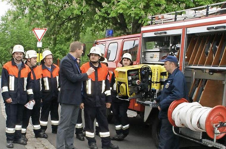 Aus Schwäbisch-Hall importiert 25.500 Euro kostete das Fahrzeug, das vorher in Schwäbisch-Hall im Einsatz war. Einen Teil der Kosten übernahm der Feuerwehrverein. Dessen Vorsitzender Hans-Peter Ott und die Kommandanten Frank Schilling, Johannes Dürr und Heiko Oppelt erläuterten Bürgermeister Matthias Bäuerlein gerne das Innenleben des neuen Fahrzeuges. Nicht nur der 600-Liter-Wassertank beschleunigt die Einsatzfähigkeit der Atemschutzgeräteträger, sie können jetzt auch während der Fahrt ihre Pressluftatmer anlegen. Die sind nämlich nicht mehr in einem Schlitten irgendwo im Fahrzeug verstaut, sondern in die Sitzbänke integriert, die Feuerwehrleute schlüpfen also während der Fahrt in die Gurte und legen die Masken bereits an.