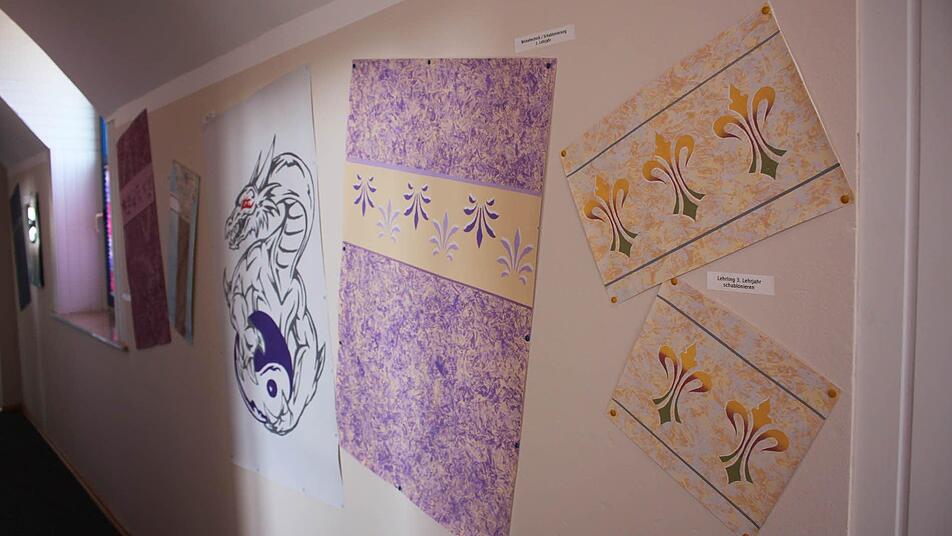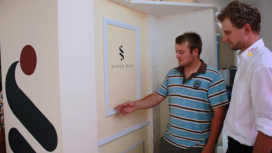 Gesellenstücke präsentiert Die Malerinnung nutzte die Gelegenheit, neben den neuen Räumen auch die Gesellenstücke der diesjährigen Auszubildenden im dritten Lehrjahr vorzustellen. So waren viele Azubis mit ihren Eltern und Familien gekommen, um zu zeigen, was sie in den vergangenen drei Jahren gelernt haben. Bei den von den Lehrlingen gestalteten Kojen komme es vor allem auf die Technik und saubere Durchführung an, erklärte Malermeister Anton Gerstenkorn aus Ebern, der auch die überbetriebliche Ausbildung mit durchführt. "Die Azubis bekommen einen Kundenauftrag, wie er auch in der Realität sein könnte", erklärte Gerstenkorn. Teils seien Materialien und Farben vorgegeben, teils dürften die Azubis selbst kreativ werden. Die Prüfungskommission bewerte die fertigen Arbeiten.