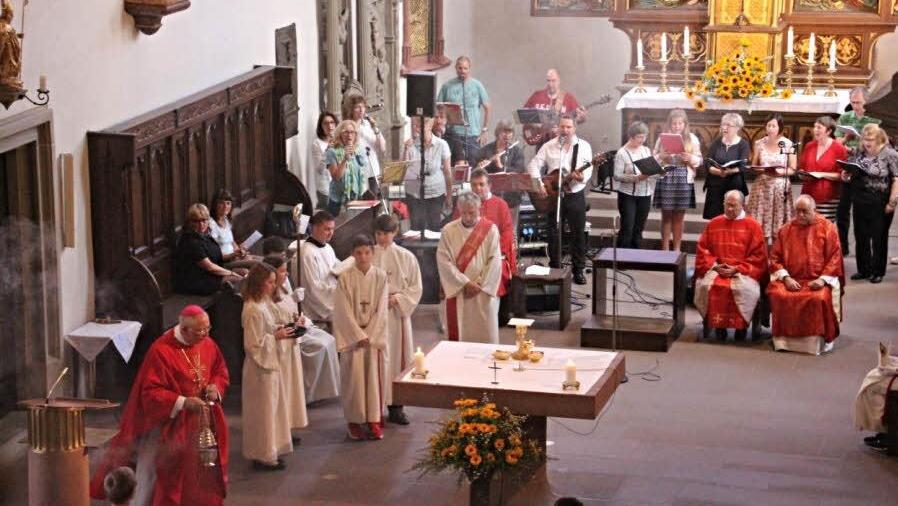 Der Dank des Stadtpfarrers galt außerdem allen Mitwirkenden, so der Musikband "Effata" mit ihrem Leiter Philipp Arnold und dem Chor "Neues-Geistlichen-Lied" unter Leitung von Kirchenmusiker Wolfgang Schneider, welche mit ihrer Musik und den Liedbeiträgen der Feierstunde einen würdigen musikalischen Rahmen verliehen.