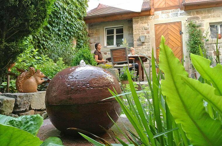 Drei Weingläser klingen sanft, als wir uns zuprosten. Für den Besuch haben die Erlweins einen guten Tropfen entkorkt. Und so erlebe ich das Lebensgefühl Zeiler Altstadt pur. Hier in der grünen Hofoase bleibt alles draußen: der Verkehr, die Geräuschkulisse der Stadt, die Unruhe des Alltags. Aus dem Vorderhaus gewährt ein großes Fenster den Blick in dieses grüne Wohnzimmer, das einst der Durchgang des landwirtschaftlichen Anwesens zum Stall war. Hier gab es Misthaufen, Scheunen, Kälberstube, Rinderstall. Nun gluckst Wasser über eine Steinkugel, in dem kleinen Beet gesellt sich grüner Buchs zu Frauenmantel, Fette Henne und Farn, und ein tönerner Drache lugt aus Hibiskus und Hortensien heraus. Diesen Hofgarten kann man auch von der innenliegenden Hofreith oben her über eine alte hölzerne Treppe erreichen, das einstige Heulager ist heute Wohnzimmer.