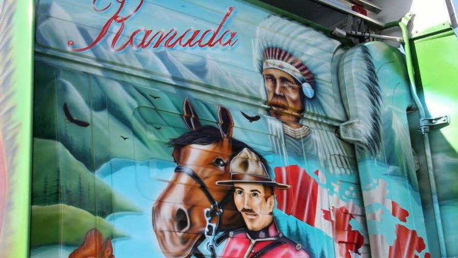 Besonders sticht sein Mercedes Actros RS mit 540 PS mit dem Kennzeichen HU - XK 222 ins Auge. Dass der Birsteiner ein Fan von Kanada sein muss, wird an der aufwendigen Außenlackierung sichtbar. Bären beim Lachsfang sind auf der Fahrertür zu sehen, Indianer und ein Beamter der berittenen Royal Canadian Mounted Police zieren mit Airbrush-Bildern die Rückseite des Fahrerhauses und dort, wo sonst ein Aufleger befestigt wird, hat sich ein Elch niedergelassen.